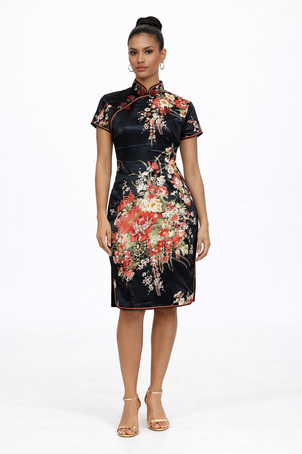 Vestido Qipao chinês com estampa floral. Excelente trabalho em costura e confecção de primeira qualidade, com rico detalhamento da gola e botões em nó chinês.